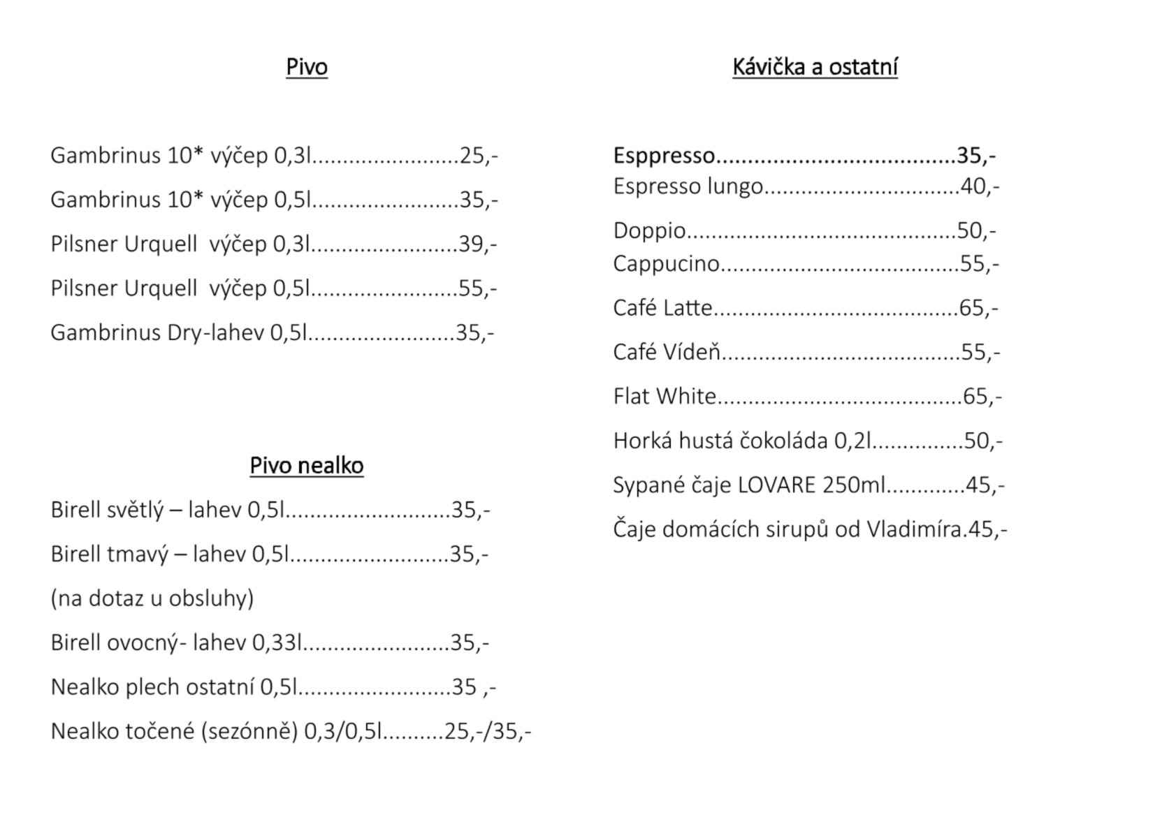 Naše prostory se skládají ze dvou výdejních prostorů. V horní části blíže silnici naleznete kavárničku s dětským koutkem a v prostorech níže naleznete tzv. "Budíkárnu" se salónkem, kde se schází místní hosté na pivečko, sportovní TV zápasy a k výhledu mají po stěnách 1500 budíků. O velkých prázdninách (či chřipkových týdnech) je z důvodu absence návštěvníků (dovolené) otevřen jeden výdej, a to právě Budíkárna, kde ale o kavárenskou nabídku nepřijdete. Kavárnu míváme uzavřenou pouze pondělky a soboty jsou k dispozici pouze na rezervace oslav.